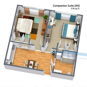 We offer a variety of floor plans to meet your needs, including private 1-bedroom suites, companion suites, and memory care options—all within a single-level, easy-to-navigate community.