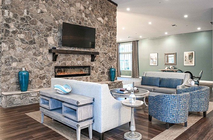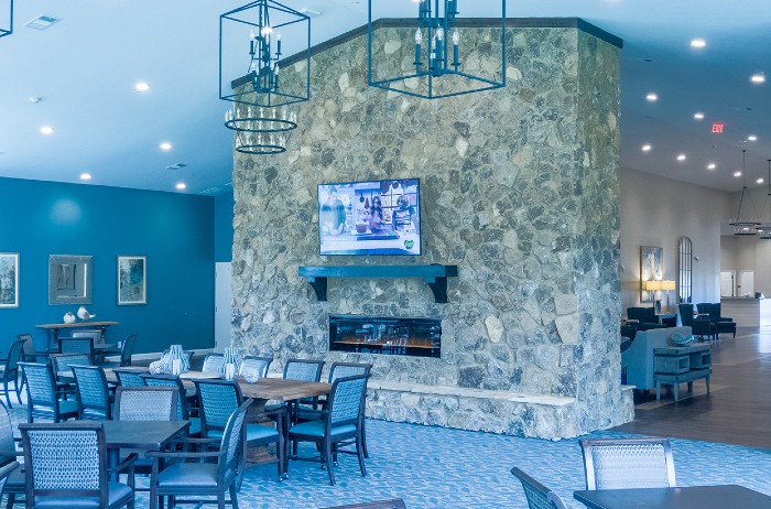Inside, the community projects a warm lodge-like feel with a stunning central fireplace in the dining room. The building embraces a central courtyard filled with professionally tended gardens.